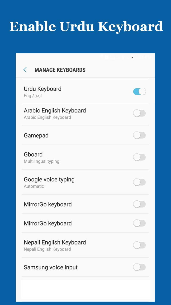 - Turn On or Enable "Urdu Keyboard (Eng/اردو)" and go back to the App.