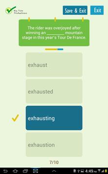 It tests users on over 85 adjectives including the ‘ed’ and ‘ing’ forms as well as the base verb form and the noun (where applicable).