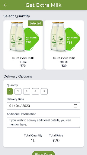 With our App, you can make Secure Payments, Subscribe to our Fresh Cow Milk, Place Orders for our other products, Inform about your Vacations, Get a Summary of your Purchases, and much much more.