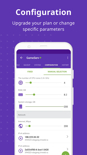 Manage your VDS/VPS from our app on any device, gain control over our virtual server resources and get a 24/7 assistance from the Timeweb support team.