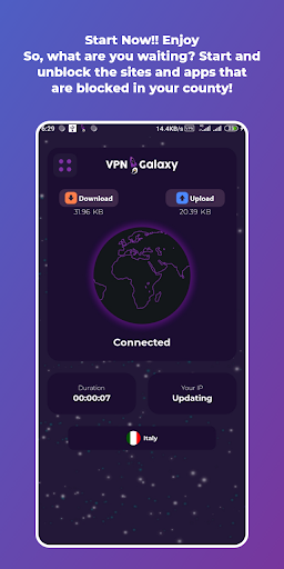VPN Galaxy is a 100% free (better than a paid VPN), fast, unlimited, stable and useful VPN (Virtual Private Network). It hides and changes your IP address, encrypts your internet traffic, turns public Wi-Fi into a private network, bypasses Internet censorship, overcomes geo-restrictions, grants access to the desired content, and unblocks sites, apps, games & global video streaming to let you access any restricted content safely and anonymously.