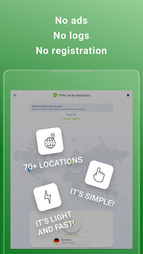 KeepSolid VPN Lite effaces online boundaries! At work, at home, or abroad - your favorite apps and sites, social media, YouTube and the like, are always there for you, offering the best content.