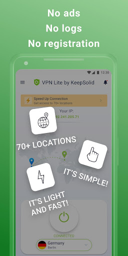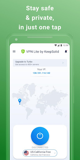 KeepSolid VPN Lite is the best VPN friend to anyone in need of private browsing and secure internet access. This free VPN for Android was designed to address users’ most common pains and to offer a simple and intuitive interface.