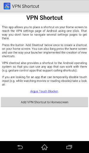 has only one purpose -- to provide you with a shortcut (either directly on your home screen or to any third party app that can use shortcuts like some gesture control apps) that brings you to the VPN settings page with only one click.