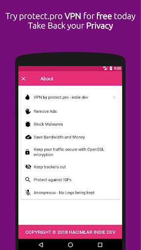 VPN by protect.pro is developed by indie team so there are no big corporations with secret agenda behind any of this also VPN by protect.pro keeps no logs, does not monitor your traffic and does not store or sell your data.