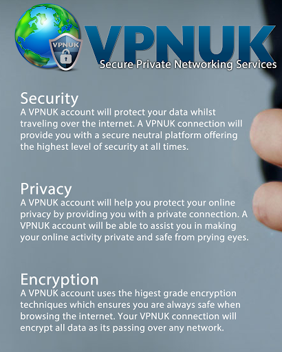 A VPNUK account will protect your data while it’s traveling over the internet and wi-fi hotspots. All VPNUK connections will provide you with a secure neutral platform offering the highest grade of security through a number of different connection types and protocols .