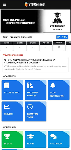 VTU Connect is a very useful Application with Previous Sem Results, Class Rank, University Rank, Class Time Table, Syllabus, Notes, Question Papers, Notifications, Chat Room and Much More which helps engineering students studying under Visvesvaraya Technological University (VTU).