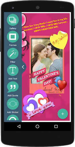 Fantastic app..... Good facilities in a single app.... Inbuilt many Stickers and Quotes which are useful to make fine Velentine pictures..Also lots of lovely frames. We can also choose any our image from Gallery. Make Awesome Valentine's Images and Enjoying.