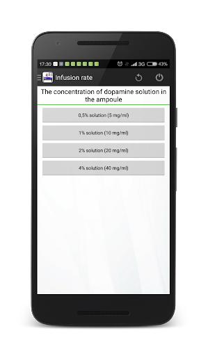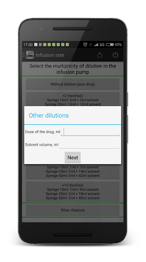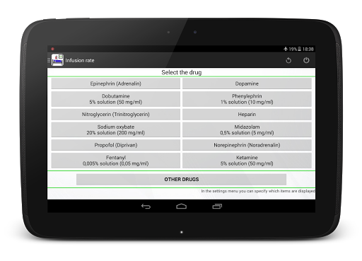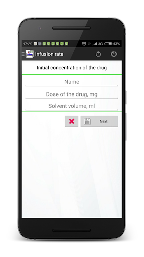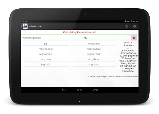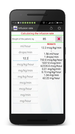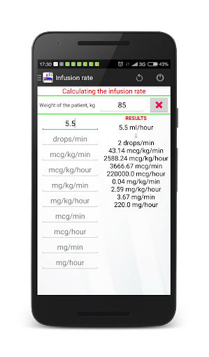 The program allows to calculate the infusion rate of drugs. You'll need to select the patient's weight, dilution of the solution. Transfer from ml/hr to mg/min, mg/kg(lb)/min, mg/kg(lb)/hour, mg/hour, mcg/min, mcg/kg(lb)/min, mcg/kg(lb)/hour, mcg/hour is fast, simple and to the minimum number of clicks. In the settings you can choose kilograms or lbs.