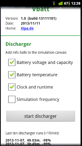 - Discharging or draining the battery by running a JBox2D** based simulation (CPU) and keeping the display on (screen light), evaluation of the runtime until the device turns off. The longer the runtime the better the battery. Before starting the discharger the battery should be fully charged and the phone should be in a comparable state (screen brightness, phone, Wifi, GPS, Bluetooth etc.)