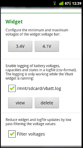 For a better estimation of the remaining phone runtime the Vbatt widget displays in addition to the remaining capacity (percentage) the battery voltage. The upper and lower limits of the voltage bar graph are configurable because especially the lower limit (power off voltage) considerably varies from device to device and according to the battery load.