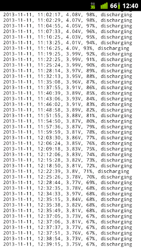 - Optionally logging the battery voltage, capacity and state in a CSV logfile on SD-Card: "/mnt/sdcard/vbatt.log". The logfile can be analysed afterwards on PC with the help of MS Excel, Open Office Calc or most suitable with GnuPlot.