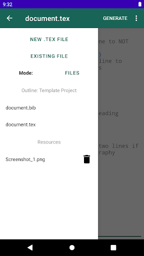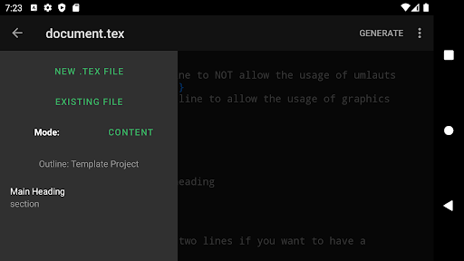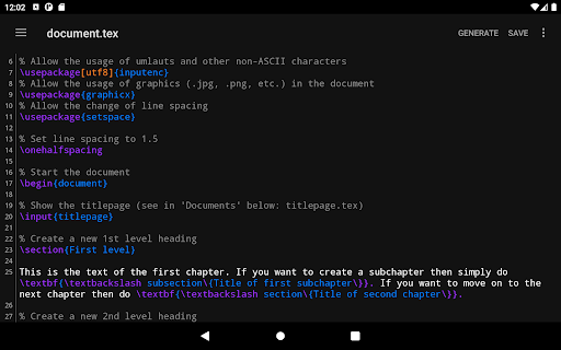 VerbTeX is a free, collaborative LaTeX Editor for your Android device. It allows you to create and manage LaTeX projects directly on your Android device and generate a PDF by using Verbosus (Online LaTeX and Octave Editor).