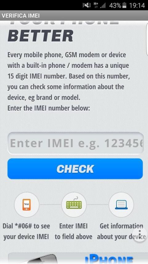 With this application you can check whether your mobile is original or a clone or is the victim of a theft you only need to enter your IMEI and you'll have an immediate response directly from this application.