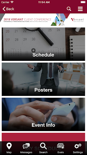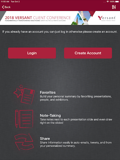TheVersant Client Conference application allows you to access each Versants annual conference details. Within the underlying event apps, users can access presentations, exhibitors, and connect with other attendees. Users can also take notes adjacent available presentation slides and draw directly on slides inside the event apps.