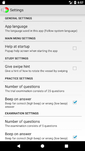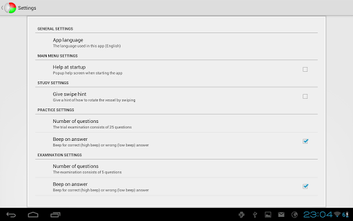 The app has some customization features such as choosing the amount of questions in the examination, whether to beep on correct/wrong answers, and the language.
