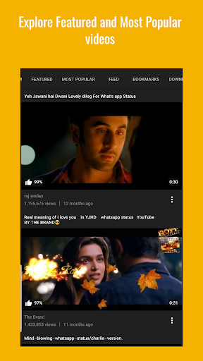 . This video status for WhatsApp downloads the favorite songs lyrically describing your mood. It refreshes the mood and makes you feel lively again. So get lost in the aura where song makes you describe whatever you are feeling and share your life with your friends. Here, you can download