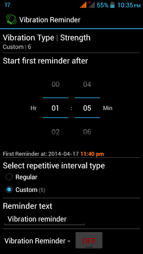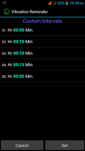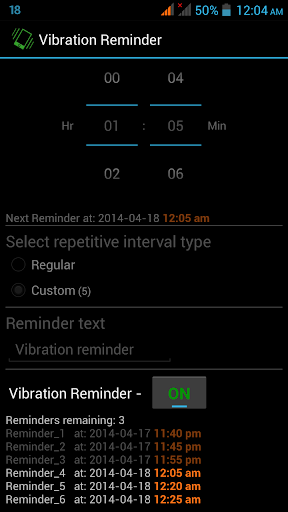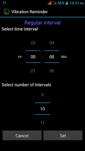 * This app will be useful, when you cannot take out the phone frequently to check the time(like in a meeting or riding bike). Using this app you can set the time intervals, at which the vibration reminders has to go off.
