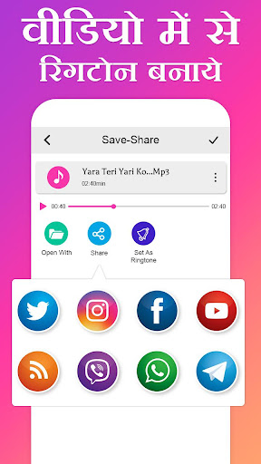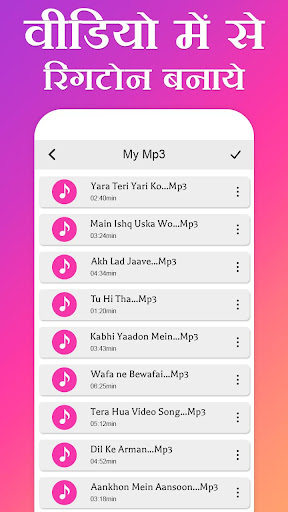 Video Me Se Ringtone Banaye app allows you to make ringtone from video song. Make mobile ringtone from any video song. This app supports all video formats and play all videos.
