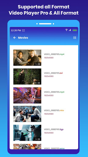 Video Player supports all video file formats including MP4, WMV, AVI, FLV, MOV, MKV, 3GP, MPEG, MPG, M4V, MTS, etc.