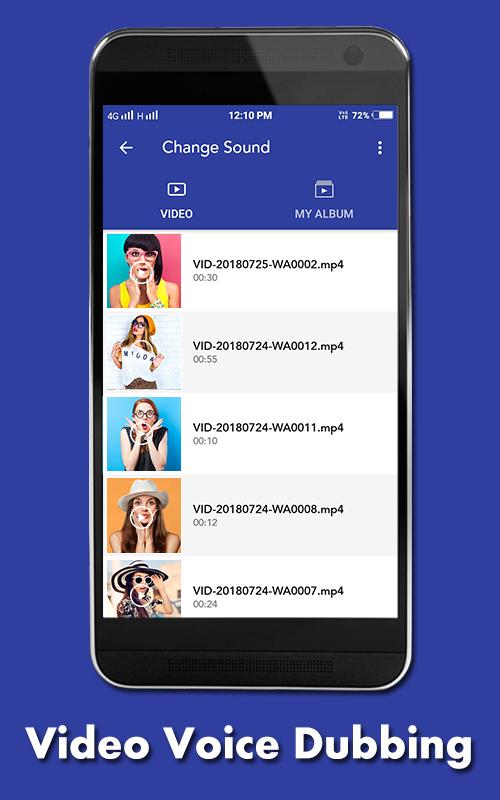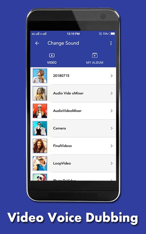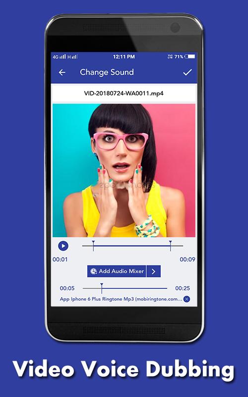 Video Voice Dubbing App provides a facility for changing Background Music of any video files.Audio video mixer is one type of video editor app, using this app you can add or mix your favorite audio files to video files. This app manage audio file size if the audio file length is larger than video files, it will be automatically trim audio to video's duration.