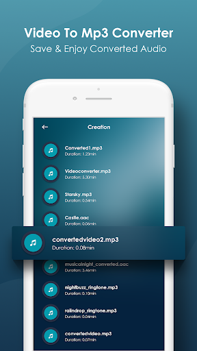 . convert all kind of video file into mp3. Using Video to MP3 you can easily extract audio from any video you have. You can convert video files to audio files (MP3, AAC) with various options (size, bitrate, meta data) You can extract the audio and save to the folder of your android device.