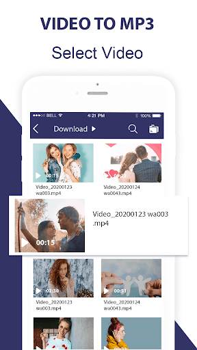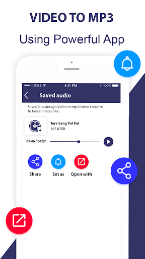 Convert to MP3 from video with selected time intervals as you like and save in phone with same mp3 quality in video.Video to Mp4 to Mp3 uses ffmpeg and libmp3lame as library.