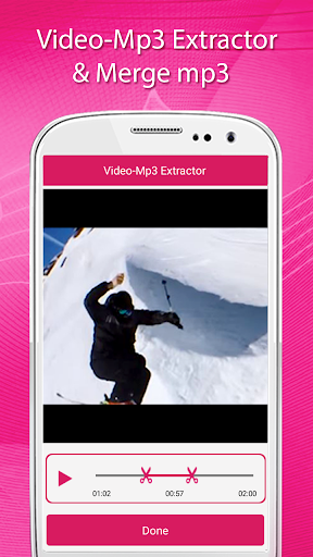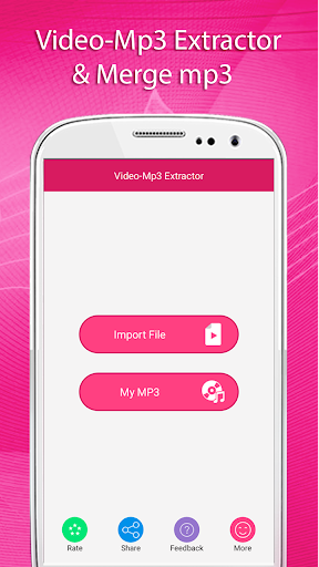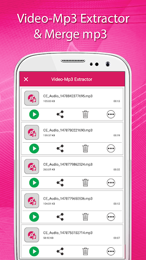 This application converts any video files to audio files. Using this Video-Mp3 Extractor,Video-mp3 Merge You can cut the favorite part of your Video song and save it as your Music File. With this Video-Mp3 Extractor, Video-mp3 merge you can easily merge your favorite videos mp3 into a single mp3 file.