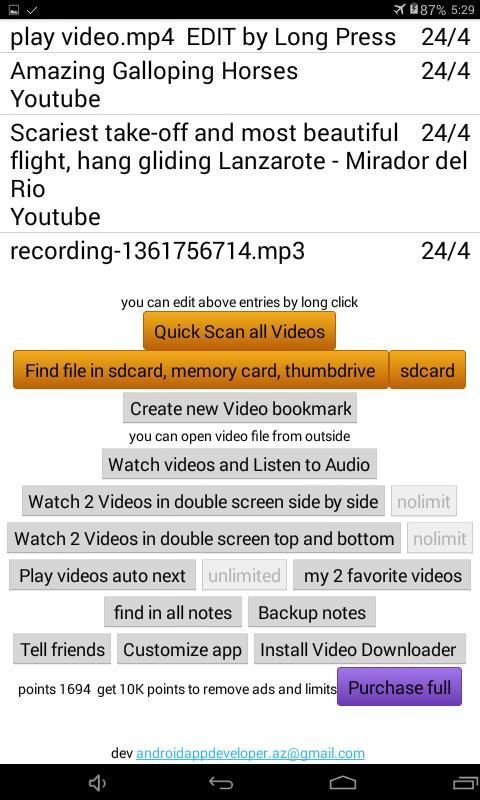 Gain points to remove ads (or disable wifi to switch off ads) and limits to new/save video bookmarks, limit of 10 double-screen.