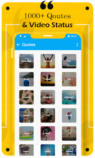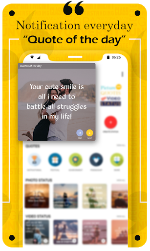 * Quote For The day or Video Status for the day :- We send you to knew Quote everyday which you can then save it as Picture Quote using Quotes Creator or save it as Video Status for Whatsapp and other social media.