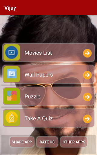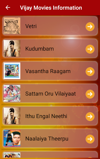 This Application displays the information of Vijay movies, it will not play any video or audio of his movies, it is a multipurpose application to Vijay fans, and App contains four options.
