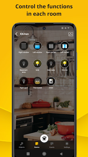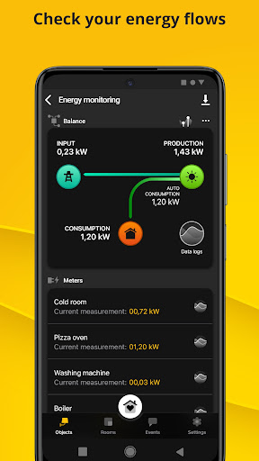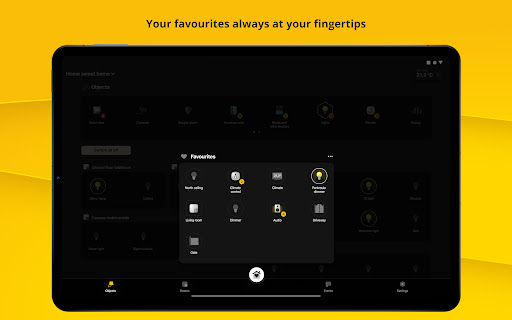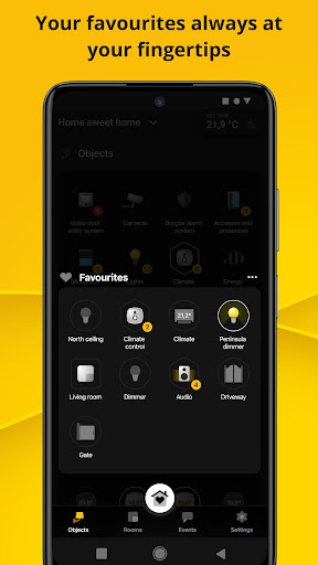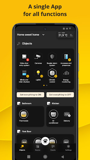 The interface is organised to allow user-friendly browsing by function (“Objects”) or by environment (“Rooms”): popular icons used in the main operating systems, customisable labels and swipe gesture controls help to make the Vimar home automation system extremely user-friendly.