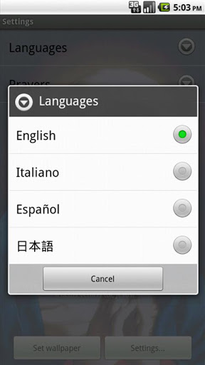 English, Italian (Italiano), Spanish (Español), sostegno italiano, el apoyo español, some prayers in Japanese translation, 日本語訳でいくつかの祈り。 Support for **all screen sizes and densities**, including tablets, default orientation both landscape and portrait. Free version has one image. Full version has nine images. Free version is a fully functional wallpaper.