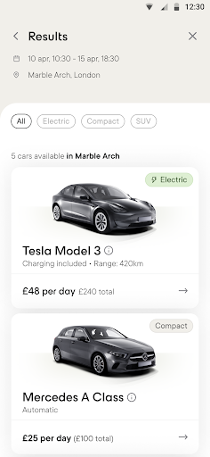 Book from a selection of premium cars. In the UK, you can rent a Mercedes A-Class or Mercedes GLA, from 1 to 90 days with a generous 150 miles per day included. In France, you can rent even more car models (BMW, Tesla or Peugeot). Trip to the sea? Adventure to the countryside? Whatever the occasion we have a car for you.