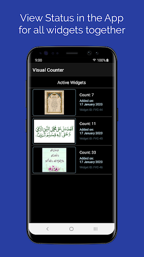 Visual Counter is a widget for your mobile home screen to work as a counter or tasbih. Add an image of ayat, zikr or anything to you want to recite. Hit the “ ” button to count and it will display the total count in the widget, you don't have to leave your mobile home screen or launcher.