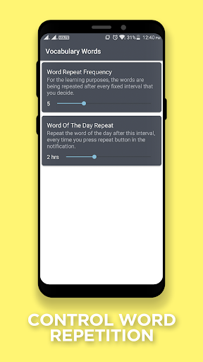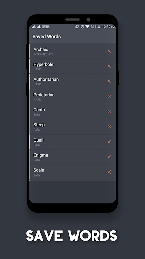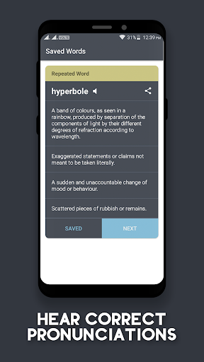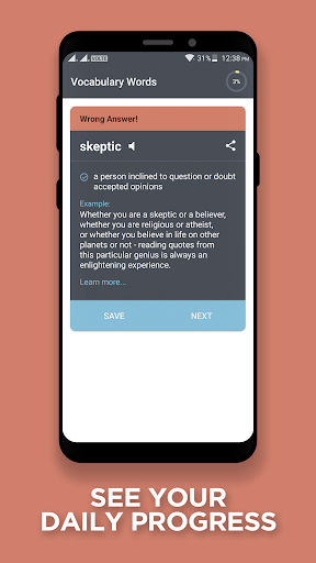 Vocabulary Builder app's WORD OF THE DAY feature provides you with an English Word every day so you learn a new English word every single day. You are reminded to learn new Vocabulary words by playing this Vocabulary Builder app every day with motivational quotes, so you don't lag behind.