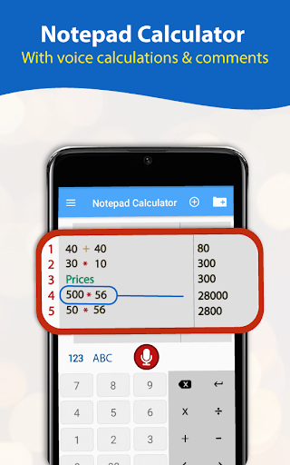 Calculator notes App allows you to just speak the mathematical expression and all the calculation will be made automatically. All the calculation you made will be saved in the notepad so you can review it later.