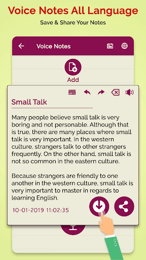 Sometime not convenient to write notes that time Voice Notes all Language Easy Voice to Text Notes app helps to write small notes and important ideas quickly by your voice without using keyboard.