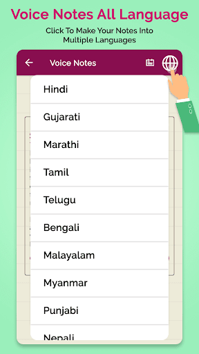 Voice Notes Included Gujarati Voice Notes, Tamil Voice Notes, Telugu Voice Notes, Kannada Voice Notes, Malayalam Voice Notes, Nepali Voice Notes, Marathi Voice Notes, Bengali/Bangla Voice Notes, English Voice Notes, French Voice Notes, Spanish Voice Notes, Italian Voice Notes, Arabic Voice Notes, Bulgarian Voice Notes, Catalan Voice Notes, Greek Voice Notes, Estonian Voice Notes, Persian Voice Notes, Finnish Voice Notes, Hebrew Voice Notes, Hindi Voice Notes, Hungarian Voice Notes, Indonesian Voice Notes, Japanese Voice Notes, Haitian Voice Notes, Korean Voice Notes, Lithuanian Voice Notes, Latvian Voice Notes, Malay Voice Notes, Norwegian Voice Notes, Polish Voice Notes, Portuguese Voice Notes, Romanian Voice Notes, Russian Voice Notes, Slovak Voice Notes, Slovenian Voice Notes, Thai Voice Notes, Turkish Voice Notes, Ukrainian Voice Notes, Urdu Voice Notes, Vietnamese Voice Notes, Chinese Voice Notes and more.