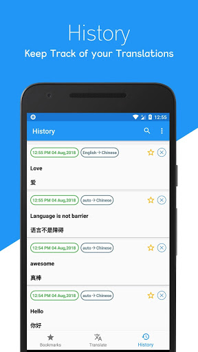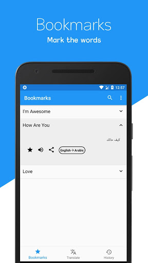 You can also bookmark your desired words direct from translator for quick access later. This app also AutoSaves the history of the translation offline so you can access it later without need of internet connection.