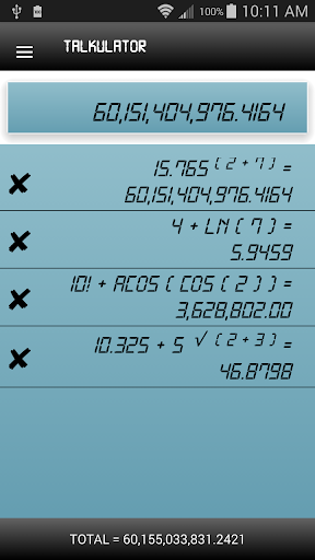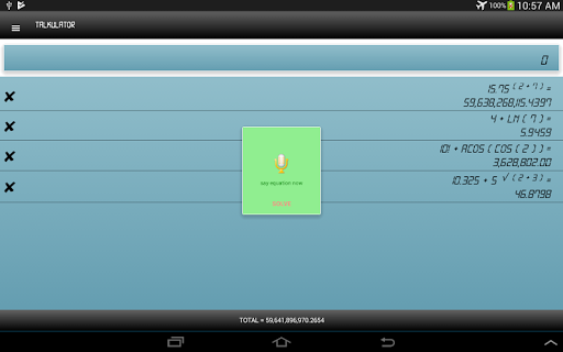 The best calculator on the market that will calculate using speech recognition.Voice Calculator works so well that keyboard input is not even provided in the app. You can see your previous calculations at all times and delete a specific calculation.