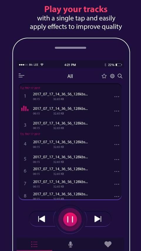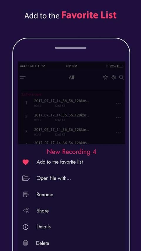Audio recorder helps you manage your recording files on a list screen with many options: sort by name/date, edit name, playback, cut, delete, share.