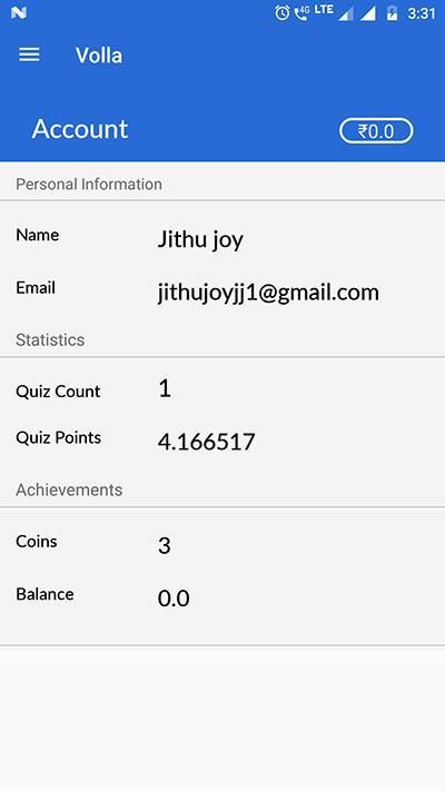 The game offered by Volla is Quiz.Quiz questions include history,science,sports and so on.You can play 5 quiz games each day.Scores get added up to a total of 50 points.