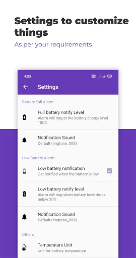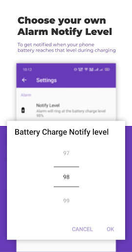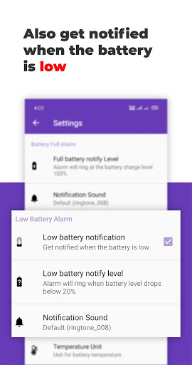 By using this app you can get notified either when your device is fully charged or extremely low. All you need to do is set your preferred battery level for the notification and enable the alarm.