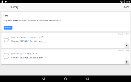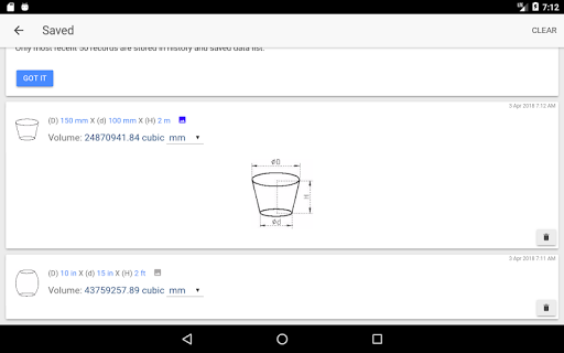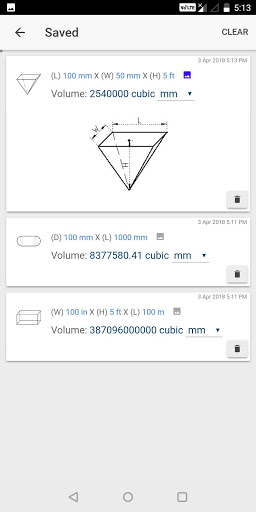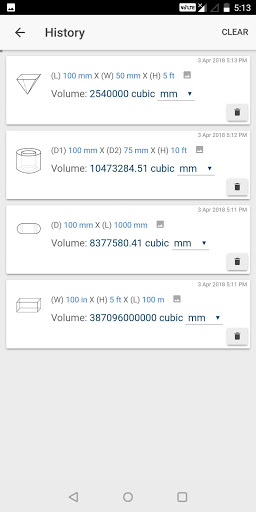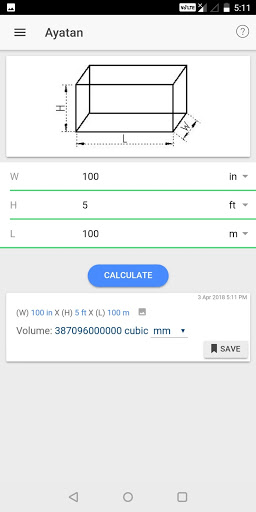 Unique feature of this app is it allows to save the calculation, maintains history of calculations, allows to set default volume unit and dimension from setting page