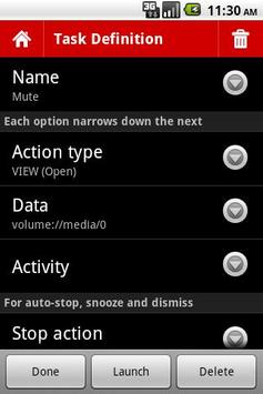TaskBomb is an automation app (sometimes called "task scheduler", "job scheduler", "batch processor", etc.) that allows you to schedule apps and actions to automatically run. It's similar in function to the cron command on Linux and somewhat like an alarm clock (you can set alarms and snooze actions). TaskBomb aims to be small and simple, and leverage the power of the apps you have on your phone.