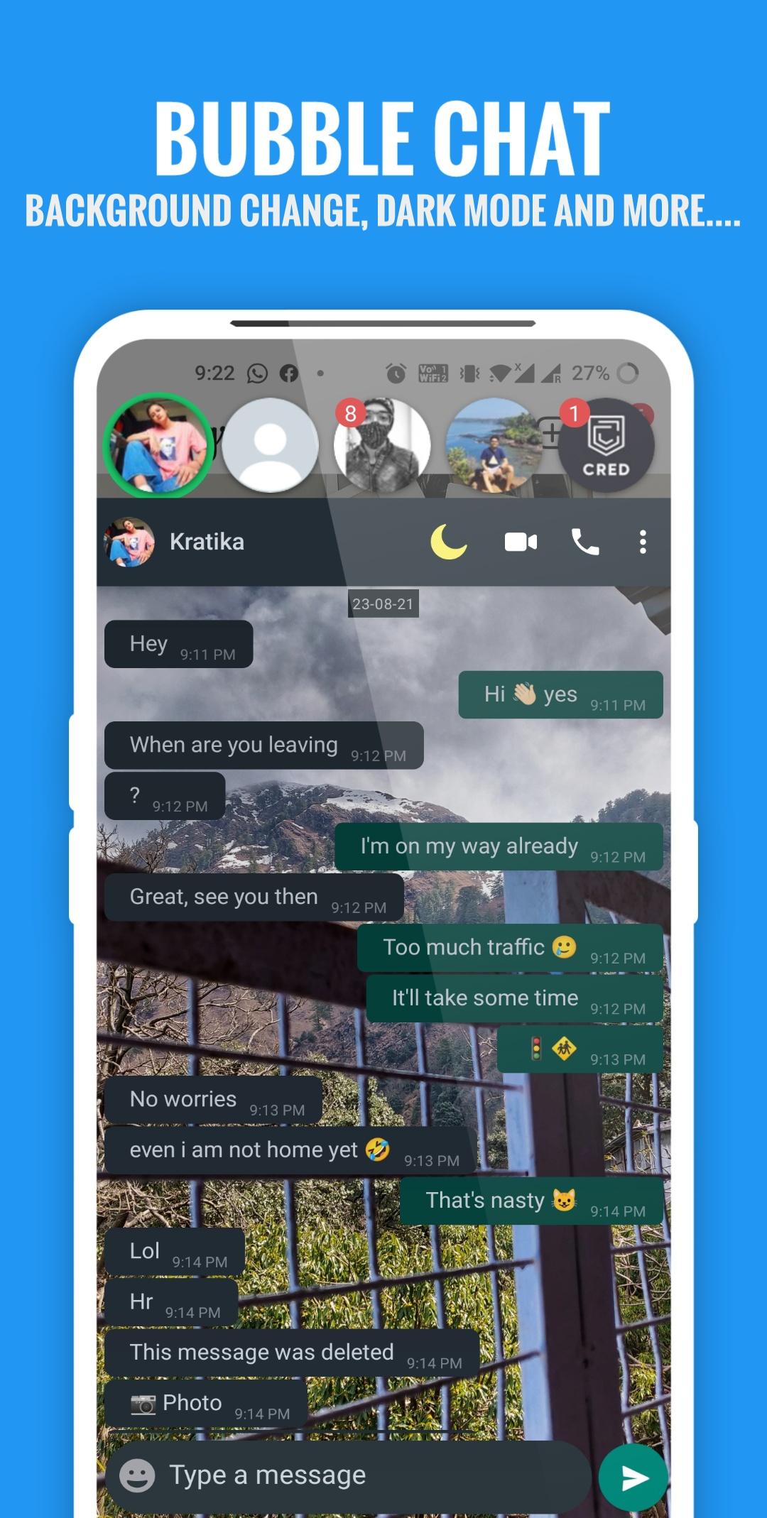 Enjoy Chatting with your friends without interruptions anywhere in your device inside a Chat Head, available with Dark mode! WAPunch Bubble Chat also allows you to change background of the chat.