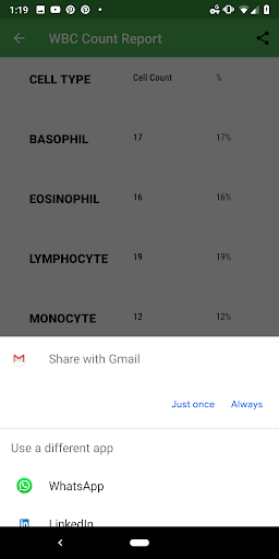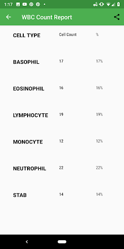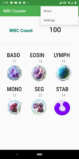 This app supports neutrophil, segmented, band, eosinophil, basophil, lymphocyte, monocyte counts.