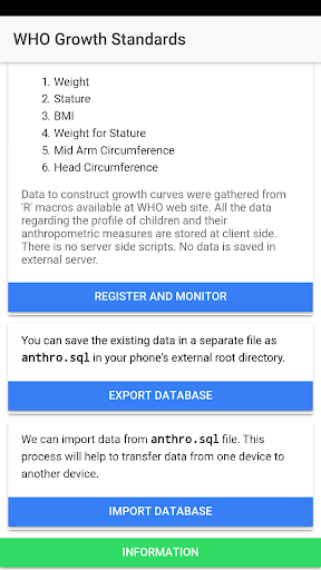 In this application, we are having useful widgets to classify growth parameters for children younger than five years and as well as older children.Calculation is based on WHO growth standards. Weight,Stature,BMI,Weight for Stature,Mid Arm Circumference,Head Circumference and mid parental height are the parameters considered.Z scores and Percentiles are calculated for the parameters.Data to construct growth curves were gathered from 'R' macros available at WHO web site.All the data regarding the profile of children and their anthropometric measures are stored at client side. There is no server side scripts. No data is saved in external server. There are options to export and import the anthropometric data gathered. Options are available to visualize and save the growth curves of individual child.