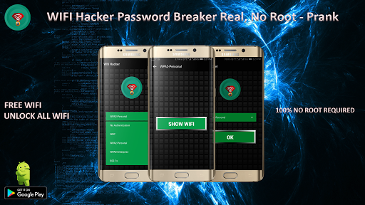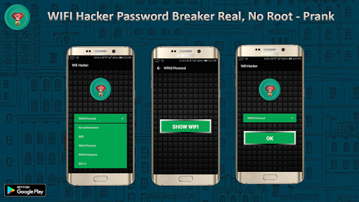 WIFI Hacker Password Breaker Real, No Root - Prank is the wifi hacking application for fun with your friends. WiFi Password Hacker makes it look like you can hack any WiFi network. It can pretend hacking into secured wifi network using General WEP, WPA2 or AES encryption and so on. It just presents a fancy animations and nothing else. So it is not harmful to the network.
